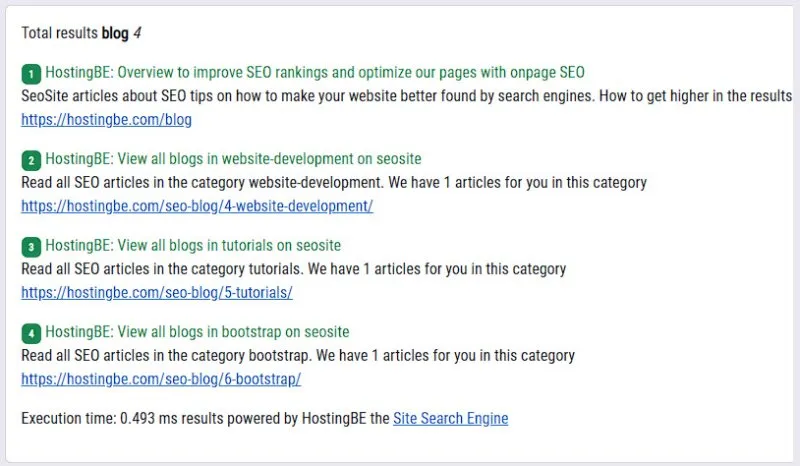 First of all, you must have created an account at HostingBE and have added your website in the dashboard so that it is indexed. If your website has been indexed you will be able to retrieve the results. To be able to show these results you need 2 API tokens, namely username and password, which you can obtain in the dashboard under API settings. Also don't forget to enter your IP address which connects to the site search engine.